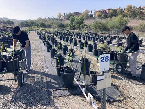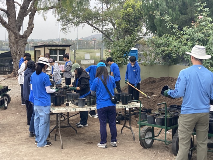 Volunteers from the Irvine Korean Parents Association Volunteer Committee, Irvine High’s SOL Club, and UCI Bee Tree attended Saturday’s nursery event. Volunteers assisted with upsizing grasses to one-gallon and five-gallon containers, placing them in tree rows and hand watering.