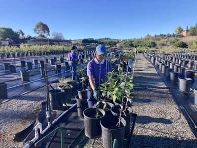 Volunteers from the Irvine Korean Parents Association Volunteer Committee, UCI American Red Cross, UCI Anteaters Tzu Ching Collegiate Association, and Woodbridge High joined us for the October 18th nursery event. Volunteers upsized grasses from two-inch liners to one-gallon containers and placed them in the tree rows, hand weeded at the tables, and assisted in watering the new trees.